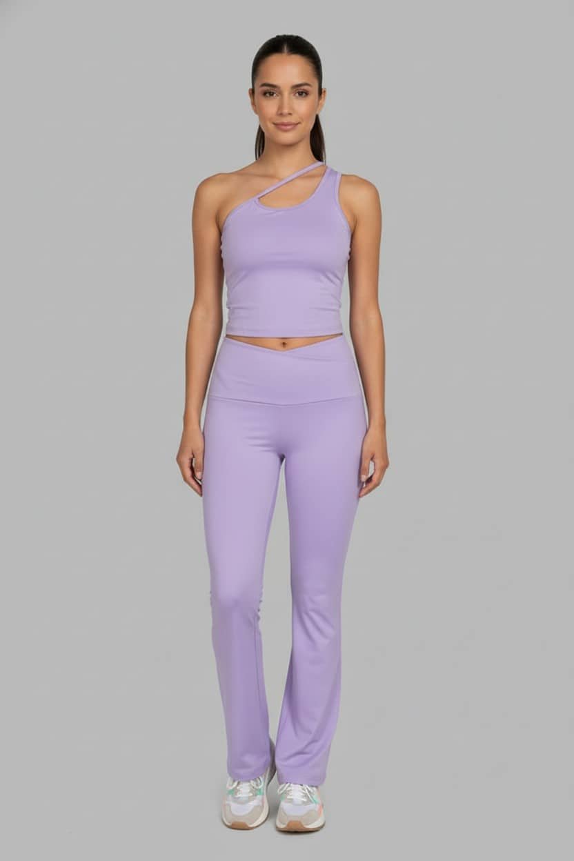 A174. Conjunto Lila Mallón Acampanado Pretina en “V” y Top con Tirante Cruzado